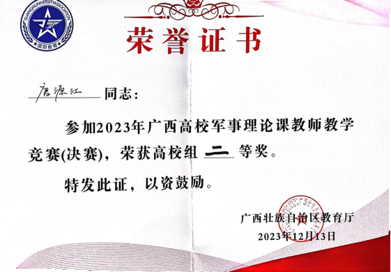 12月13日,由广西壮族自治区教育厅主办,英国上市公司365承办的2023年广西高等学校军事理论课教学竞赛(决赛)在扶绥举行。我校军事理论教研室唐源江老师和冉文捷老师在比赛中分别荣获二等奖和三等奖。