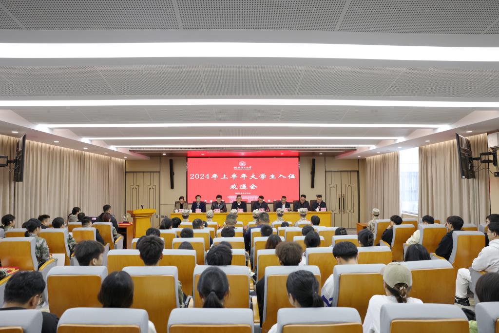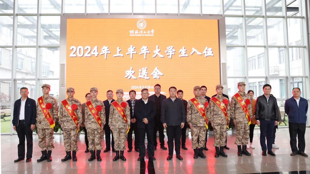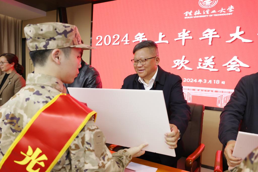 3月18日,我校在雁山校区第三会议室举行2024年上半年大学生应征入伍欢送会。学校党委书记邓军,党委常委、副校长罗盛锋出席会议。相关职能部门和学院负责人、学生代表、7名参军入伍学生及家长代表参加会议。