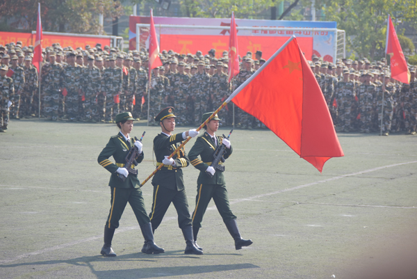 大会在庄严的国歌声中拉开帷幕。运动场上,46个连队早已列队完毕,他们军容严整、身姿挺拔,等待检阅。在雄壮的军乐声中,学校党委书记李国忠检阅了受训学生,“同学们辛苦了”、“为校争光”,同学们用嘹亮的口号展现了2019级新生饱满的精神状态。