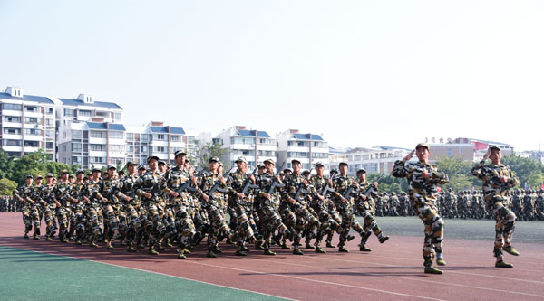 9月29日上午,我校2019级本科新生军训汇报表演暨总结大会在雁山校区运动场隆重举行。校领导李国忠、解庆林、王赣华、吴志强、陈学军、王玫、周国清、梁福沛、王敦球、曾繁荣、张劲松,广西教育厅体卫文艺处处长万锋锋、正处级调研员李春春,陆军特种作战学院副院长王炳军大校,武警桂林支队副参谋长张贤平中校出席大会。学校2019级本科新生军训工作领导小组成员和各学院党委书记在主席台观礼。此次军训承训教官、指导员和全体2019级本科参训学生参加大会。大会由学校党委副书记、副校长吴志强主持。