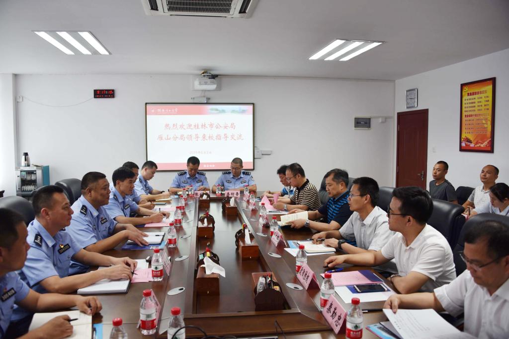 2019年6月5日上午,桂林市雁山区副区长、雁山公安分局局长卿立大、政委周长辉带领雁山分局各科所队负责人一行9人来访我校,学校副校长陈学军及宣传部、学工部(处)、保卫处负责人在雁山校区行知楼A411会议室接待了来访客人。
