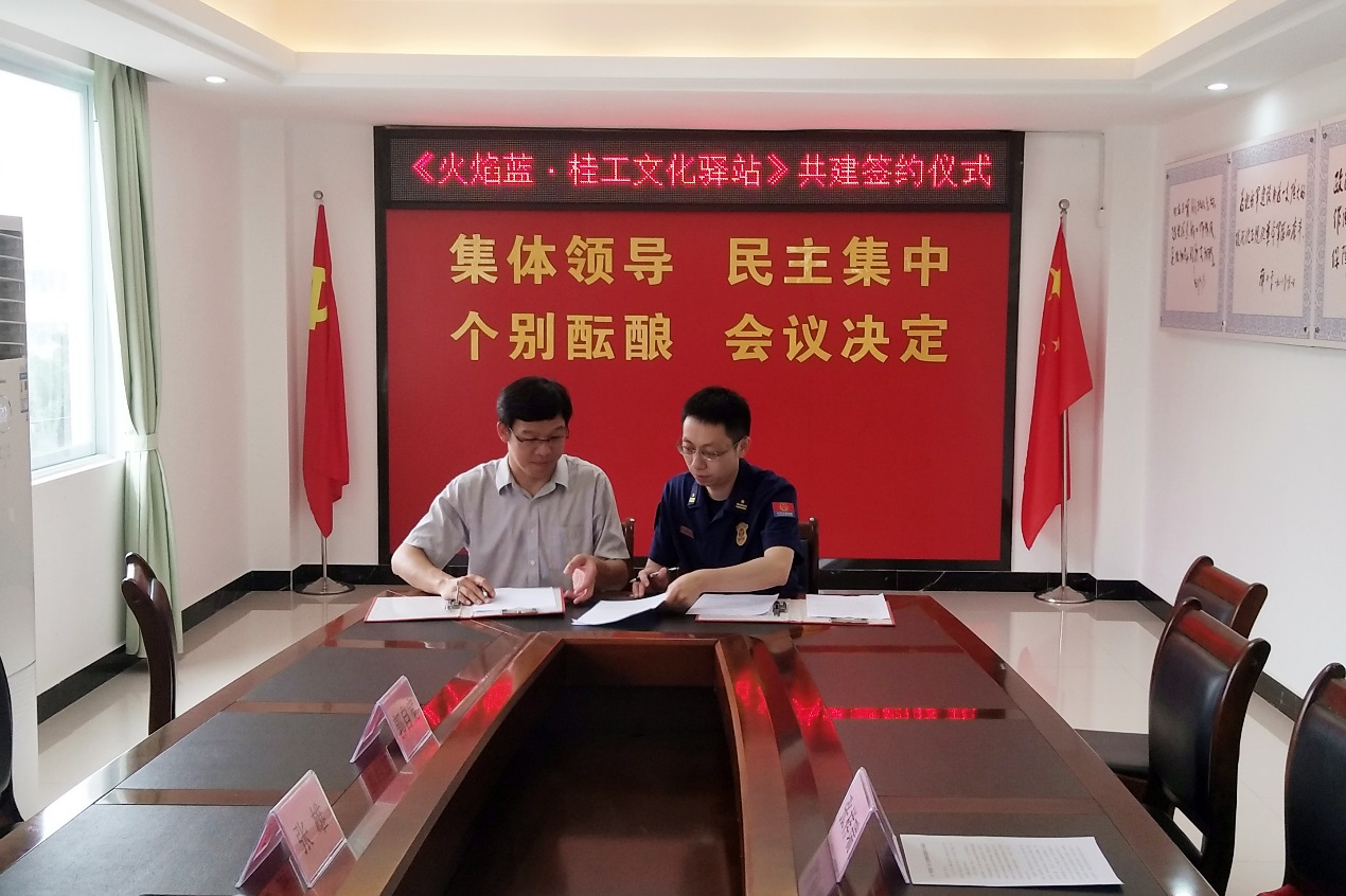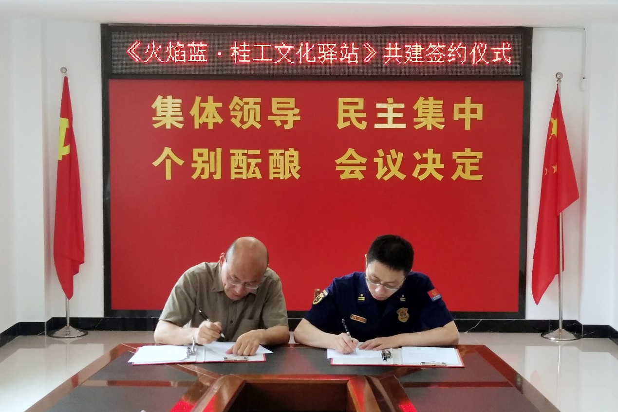 2022年6月10日上午,我校图书馆、武装部保卫处与桂林市七星区消防救援站在七星区消防救援站三楼会议室举行《火焰蓝·桂工文化驿站》共建签约暨揭牌仪式。七星区消防救援大队党委书记、教导员张祥瑞及消防救援代表,我校图书馆直属党支部书记、馆长张雄,支部副书记、副馆长郭自宽、武装部保卫处副部长、副处长黎超业及相关部门代表人员出席签约暨揭牌仪式。