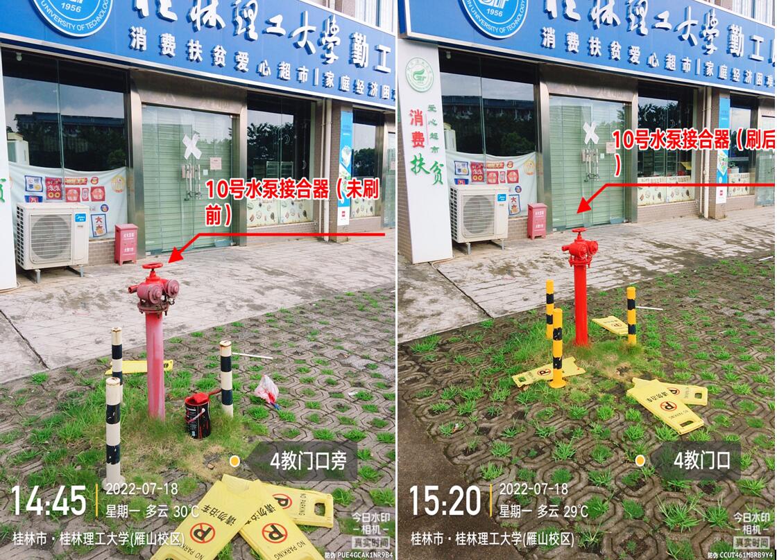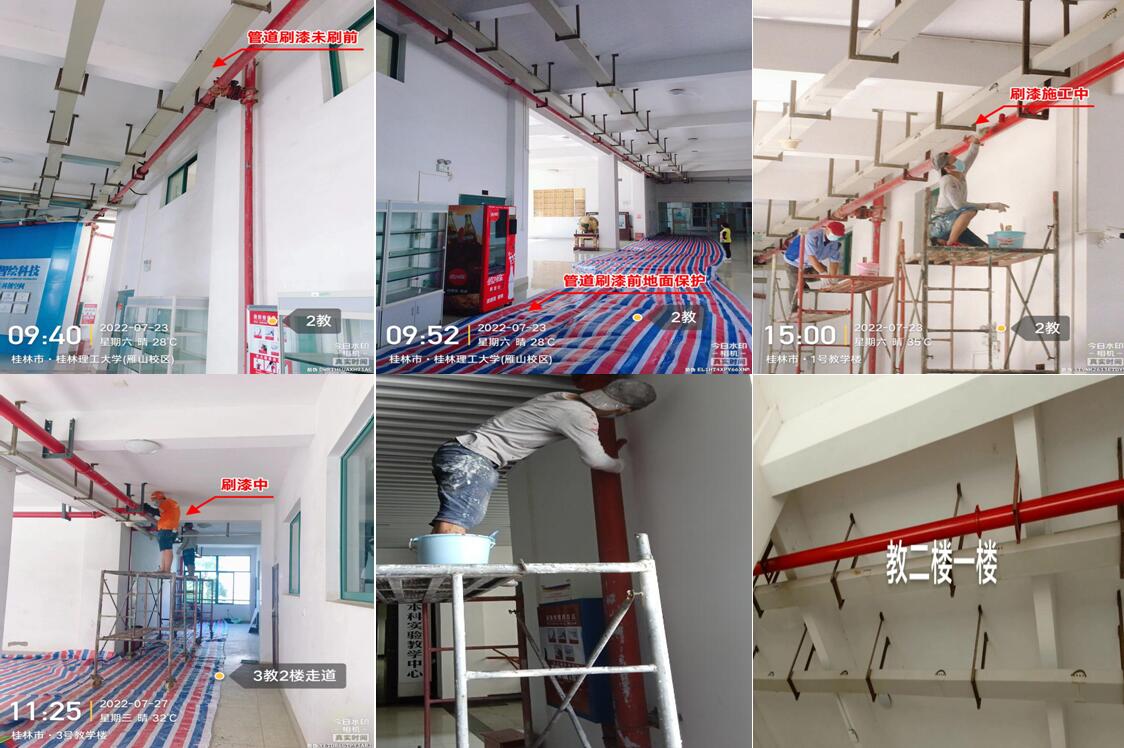 苦干实干,扎实推进。暑期高温给项目施工带来了较大困难。为确保项目质量和进度,科室加强全过程监管,号召大家发扬“特别能吃苦、特别能战斗、特别能奉献”的精神,克服困难抢工期、抓质量、保安全。施工阶段,陆大木、李路喜、彭智勇等同志不论工作日还是周末,连续十五天坚持到工地检查项目进度,为降低停水对居民的影响,多次在0点以后施工,虽然在放假期间,但是“五加二”、“白加黑”已是暑期消防工作的常态。此次施工共完成5套室内消防栓加装、1套室外消防栓改造、加装消防压力表106套、对室外消防栓除锈上漆104套、对教学楼和学生宿舍等20个楼栋进行消防管道除锈上漆,初步改变了我校消防设施设计不足及老化的状况。