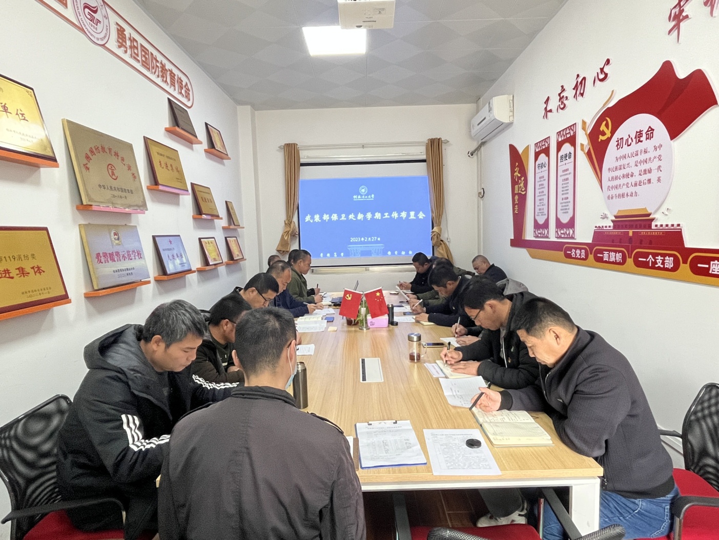2月27日上午,武装部、保卫处在屏风会议室召开新学期工作布置会,全体人员参加,会议由武装部部长、保卫处处长张瑞主持。