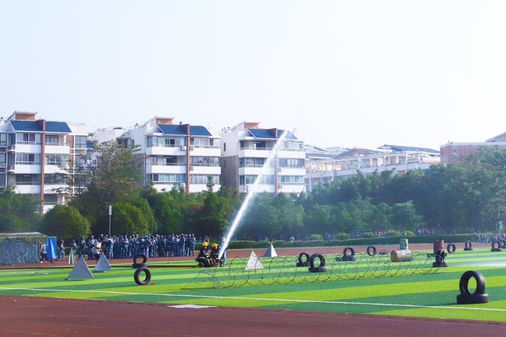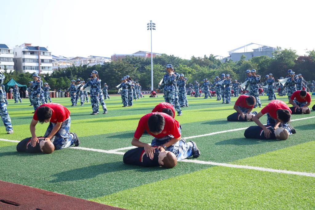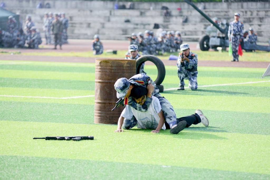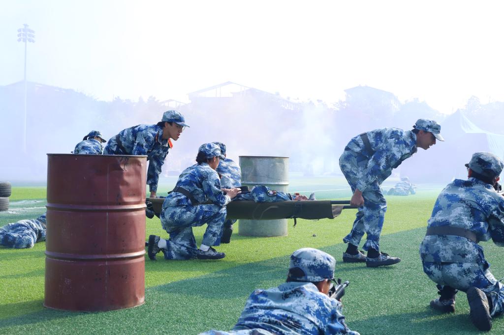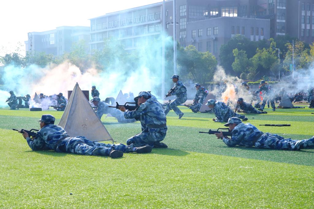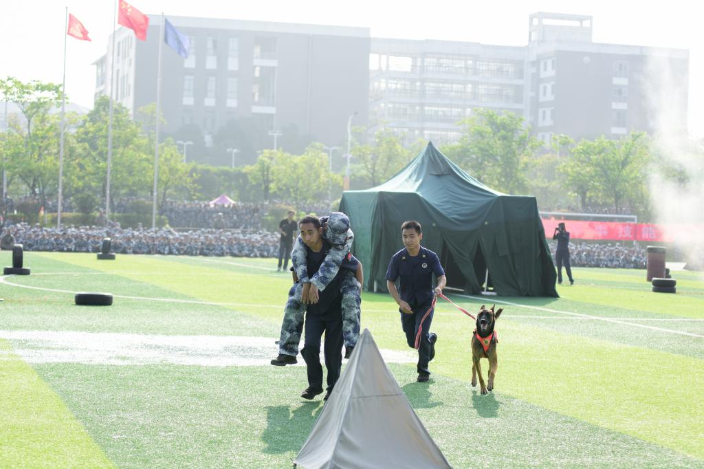 在军事项目表演中,手语操《国家》演绎了桂工青年学子真挚的家国情怀,方队成员沉着有力地舞动双手,展示对手语技巧的熟练掌握,以无声的语言献礼中华人民共和国成立74周年;女子匕首操表演气势如虹、干净利落,一突一刺、一防一击尽显巾帼气势;旗语方队队列井然有序,节奏动感明快,舞动的旗帜为训练场增添了一道亮丽的风景;男子拳术方队《军体拳》表演威风凛凛、动作矫健,“杀”声响亮、势如霹雳,一招一式彰显桂工学子的英武之气;“心肺复苏”急救表演动作熟练准确,整齐划一,增强了同学们自救互救知识与技能;战术营救表演中,“新兵”以实战面貌入场,带来紧张刺激的红蓝战术对抗演练,展示了战术推进、战斗支援、战场救护、人质营救、警犬搜救等军事科目,现场“战”味十足、气势恢宏,赢得了师生的阵阵掌声。