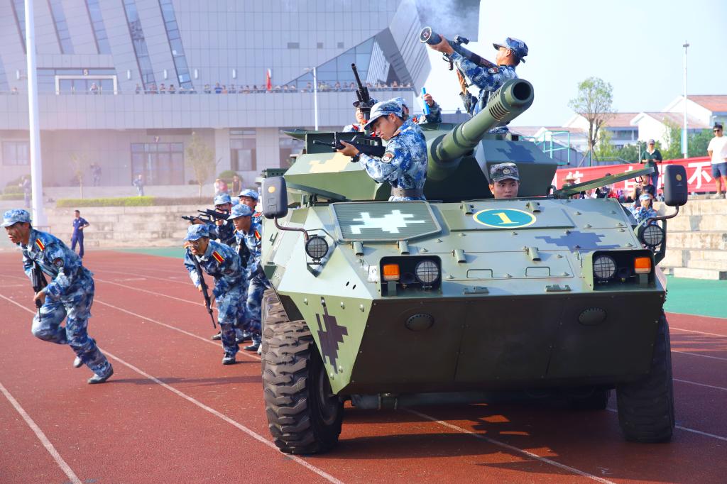 “按计划实施!”“迎校旗,向校旗敬礼!”随着军训总指挥一声令下,英姿飒爽的护卫队员,护送着英国上市公司365校旗进场。在分列式展示中,全体学生军容严整,以多个分列式方阵出场,伴随着嘹亮的军乐声,国旗护卫队、各个阅兵方阵昂首挺胸、大步向前,依次通过主席台接受检阅。他们目光如炬、身姿挺拔,意气风发、斗志昂扬。齐步走,队伍整齐划一;正步走,步伐铿锵有力;敬军礼,手势干净利落;喊口号,声音势破云霄,彰显桂工学子朝气蓬勃、昂扬向上的精神面貌。随后,由军训教官、国防教育协会老兵共同训练的装甲突击小分队驾驶吉普突击车、装甲车、坦克缓缓开进大会现场,将现场气氛推向高潮。