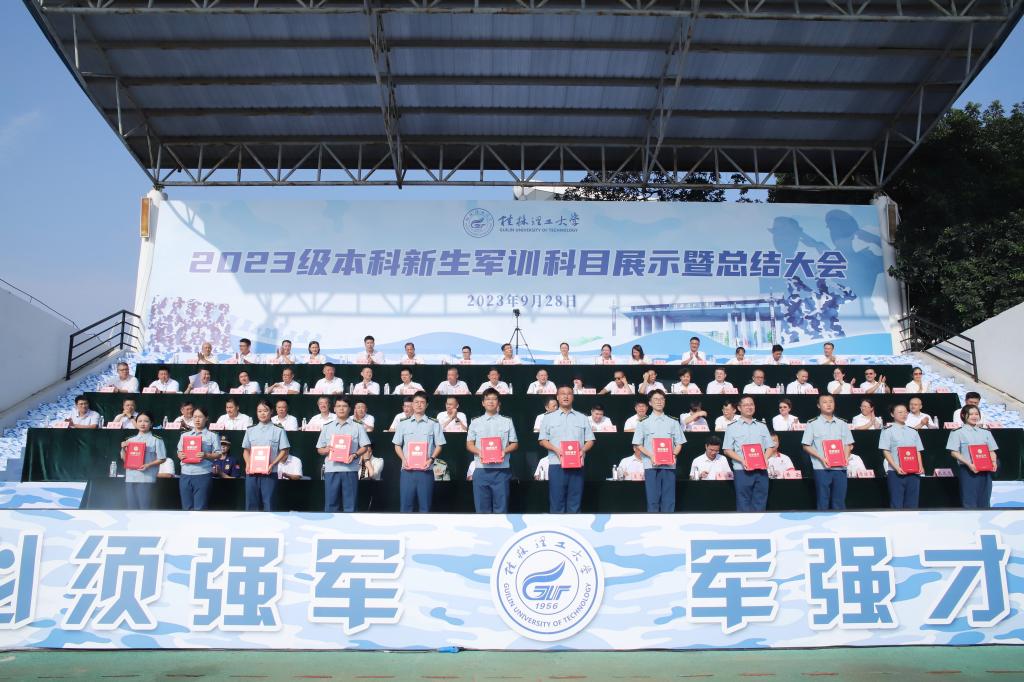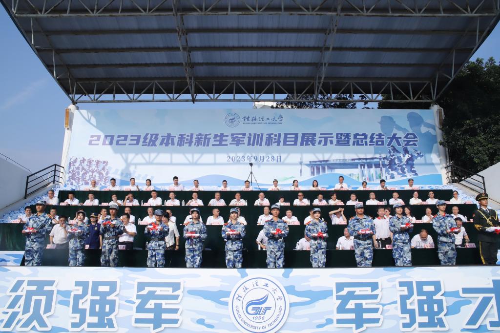 在全国上下喜迎中秋佳节、共同庆祝中华人民共和国成立74周年之际,9月28日上午,我校在雁山校区风雨操场隆重举行2023级本科新生军训科目展示暨总结大会。在家校领导邓军、王敦球、吴志强、王玫、韦学敏、曾繁荣,陆军特种作战学院副政委杜善国、广西壮族自治区红十字会救助救护部部长黄云、桂林市消防救援支队王培,校党委常委唐壮东、叶昊,校长助理张成龙出席大会。学校军训工作领导小组成员,各二级学院党委书记、院长,各相关职能部门负责人在主席台观礼。军训旅全体教官、指导员,全体2023级参训学生参加大会。大会由学校党委副书记吴志强主持。