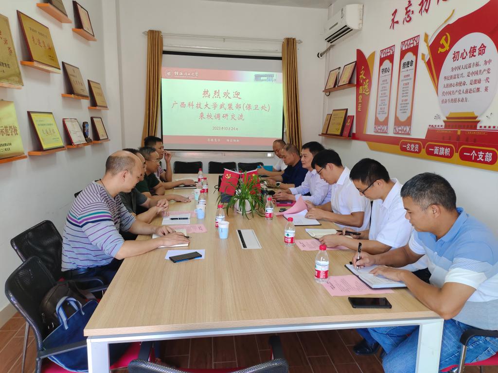 10 月 24 日下午 ,广西科技大学武装部(保卫处)部(处)长贾松林一行4人来我校调研交流,武装部(保卫处)领导班子在屏风校区103备勤室接待贾松林部(处)长一行,相关科室负责人参加座谈会。