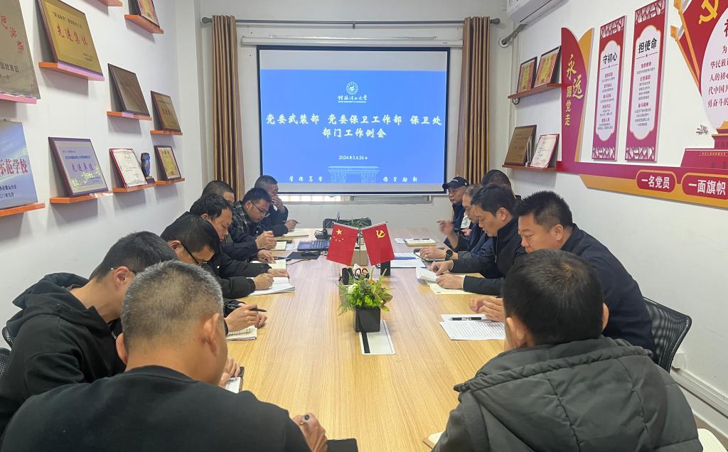 3月26日上午,党委武装部、党委保卫工作部、保卫处在屏风校区会议室召开贯彻落实学校系列会议精神专题会。会议由部门负责人主持,党委武装部、党委保卫工作部、保卫处全体人员参加会议。