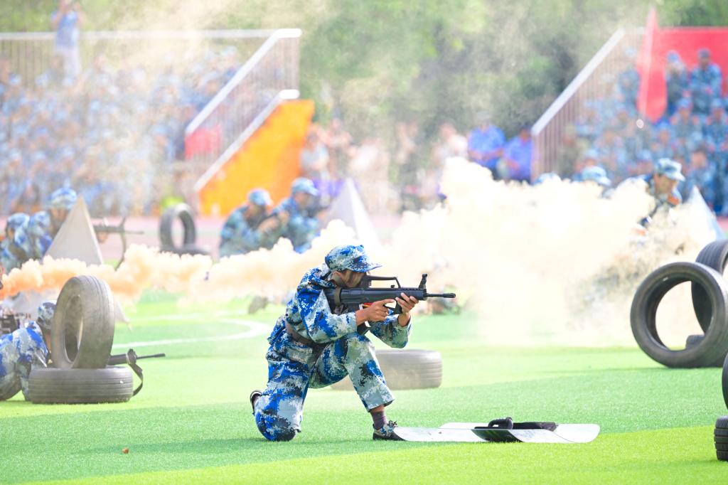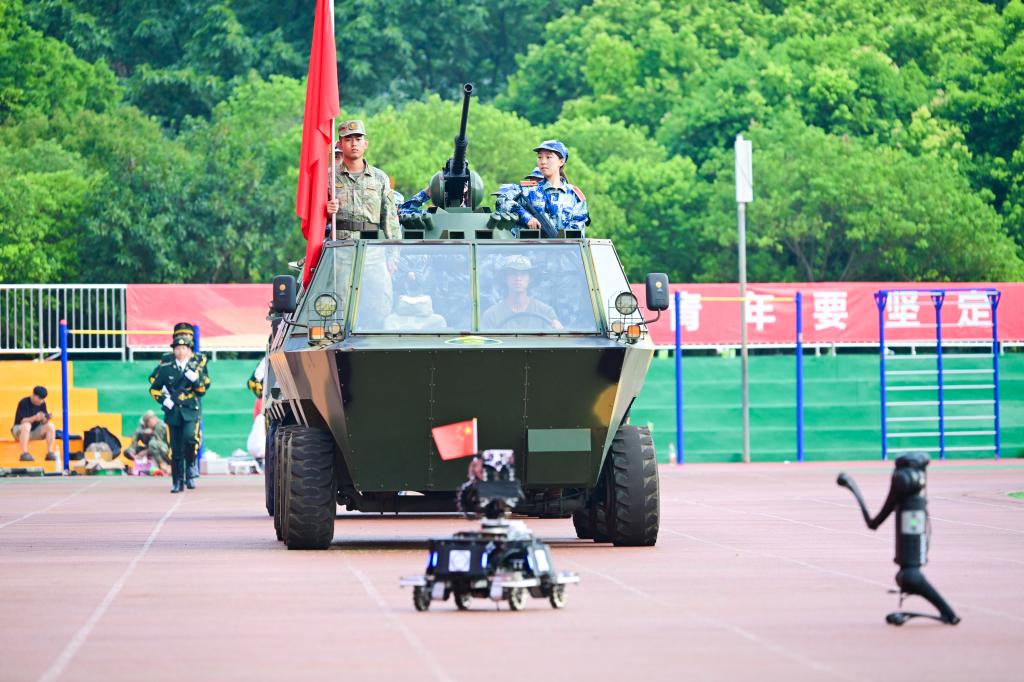 在军事项目展示中,女子匕首操展示,气势如虹、干净利落,一突一刺、一防一击尽显巾帼气势;旗语方队以倒计时的形式来展现桂工学子对中华人民共和国成立75周年无与伦比的自豪与骄傲,队列井然有序,节奏动感明快,舞动的旗帜为训练场增添了一道亮丽的风景;手语操《我爱你中国》演绎了桂工学子真挚的家国情怀,方队成员沉着有力地舞动双手,以无声的语言献礼中华人民共和国成立75周年;男子拳术方队《军体拳》展示威风凛凛、动作矫健,“杀”声响亮、势如霹雳,一招一式彰显桂工学子的英武之气;武术展示环节,一招一式中能感受到桂工学子自强不息的精神,不断砥砺品格、磨练意志、增长本领、强健体魄的决心。战术营救展示中,“新兵”以实战面貌入场,带来紧张刺激的红蓝战术对抗展示,展示了无人装备战术侦查爆破、战术推进、战斗支援、战场救护、人质营救等军事科目,现场“战”味十足、气势恢宏,赢得了师生的阵阵掌声。