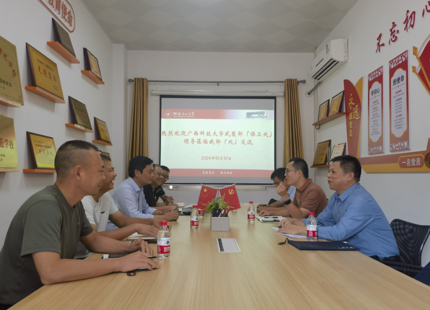 10月10日下午,广西科技大学武装部(保卫处)副部(处)长陈飞一行3人来我校调研交流,我校党委武装部(党委保卫工作部、保卫处)负责人在屏风校区后勤楼103备勤室接待来访客人,相关科室负责人参加座谈会。