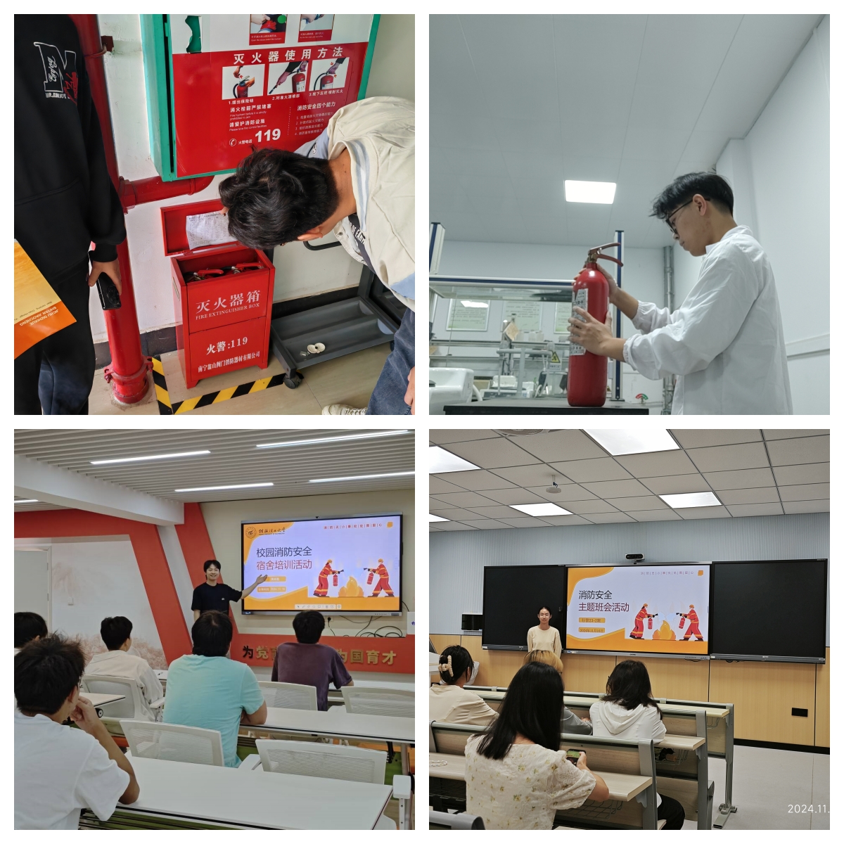 自消防宣传月活动启动以来,保卫处先后协助继续教育学院、测绘地理信息学院、机械与控制工程学院、外国语学院及学工处等部门开展消防安全知识讲座及消防疏散演练,发挥专业优势,向参训人员具体讲解火灾发生特点、要素成因和火灾防范的技术基本要求,现场演示培训常规的灭火器、水带和水枪的使用技巧和方法,参训人员热情高涨,积极动手实操,各部门共计2000余人参加培训。
