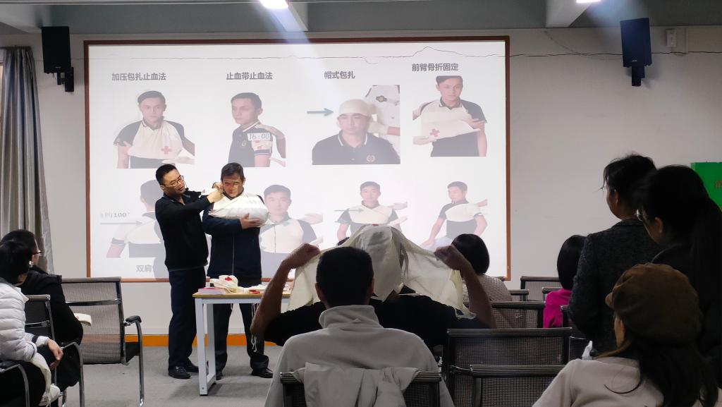 培训由广西医科大学的红十字急救专家进行授课和指导,专家详细讲解了应急救护理论、心肺复苏操作、自动体外除颤器(AED)的使用方法、气道异物梗阻急救法、日常急症救护、创伤救护技能(止血包扎、骨折固定)等方面的知识,并与现场学员进行互动交流和操作演示。