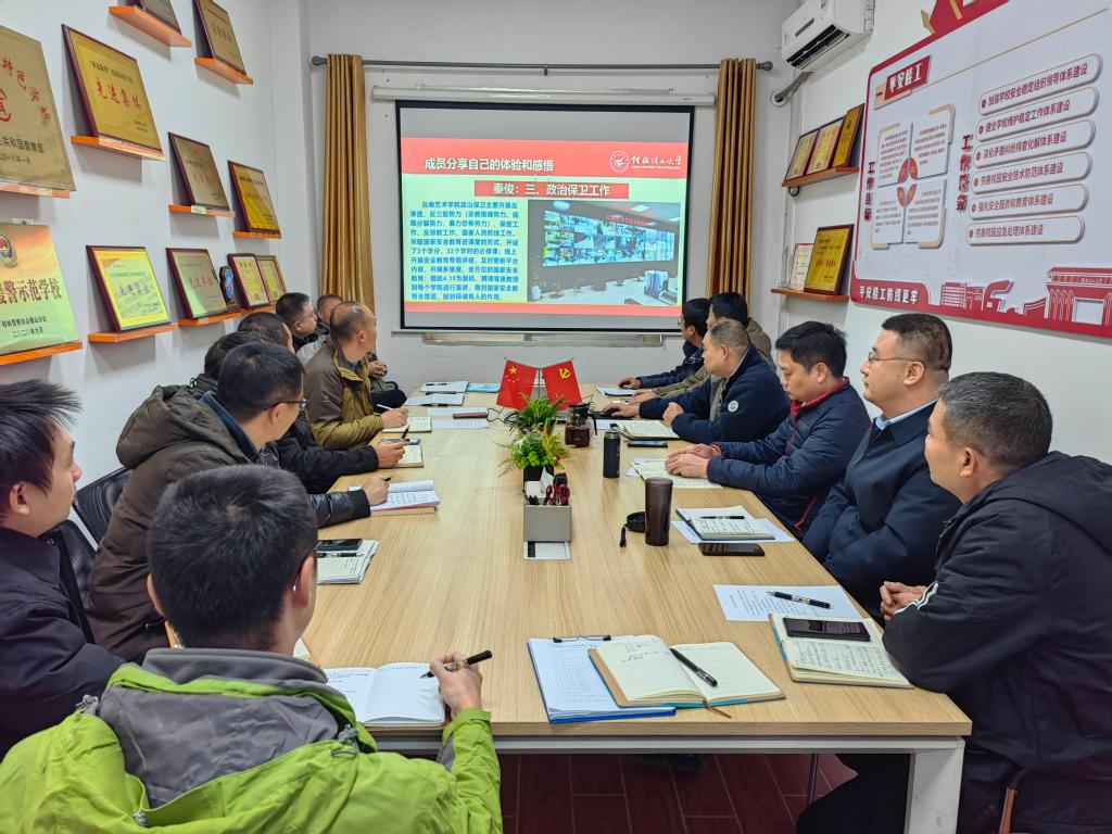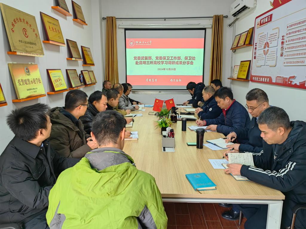 12月20日,党委武装部、党委保卫工作部、保卫处在屏风校区保卫后勤楼103备勤室召开12月部门工作例会暨昆明调研学习组交流汇报会。会议由部门负责人主持,部门全体人员参加。