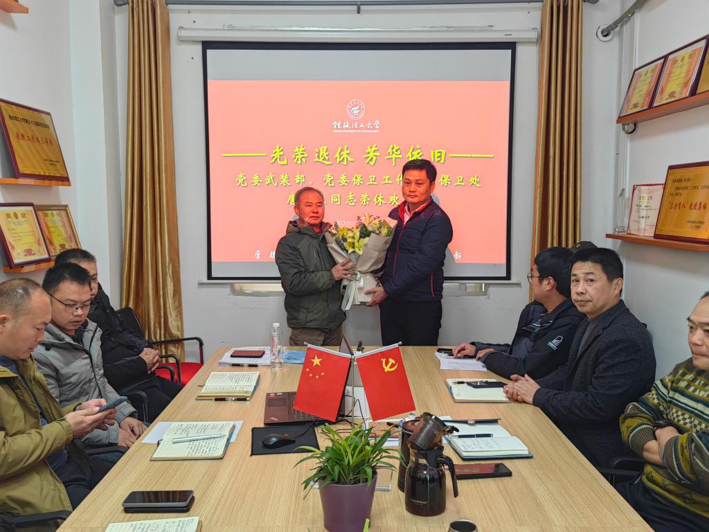 最后,为荣休的唐明生同志举行欢送仪式。部门负责人为唐明生同志送上鲜花并致辞:真诚的希望唐明生同志“退而不休”,常回学校看看,为学校工作多提宝贵建议,一如既往的关心学校的安全和发展。真诚地祝愿唐明生同志老有所乐,老有所为,身体更健康,合家更欢乐!在“人生的第二春”春风得意、春意盎然!