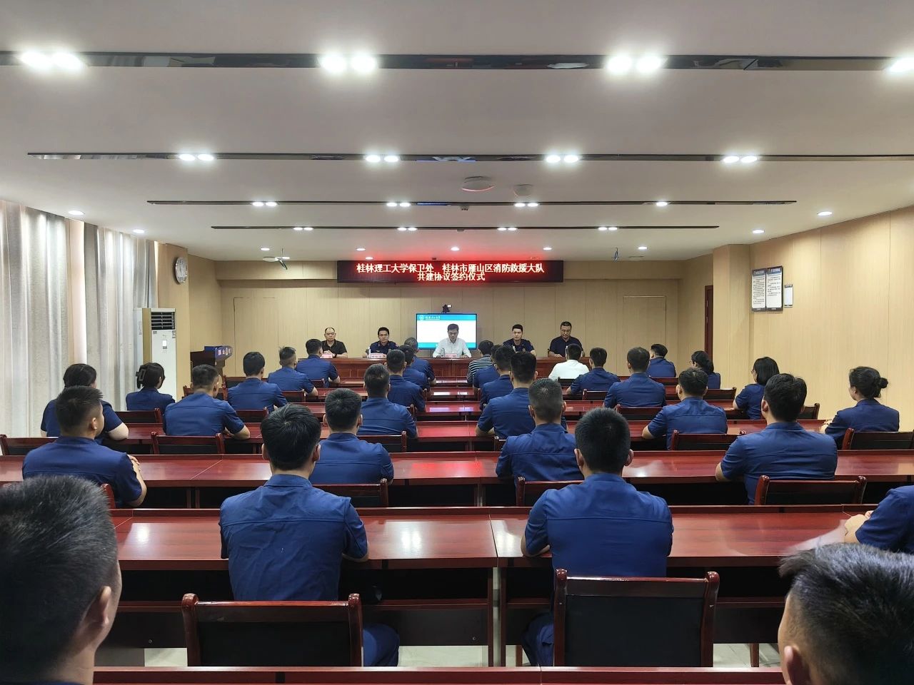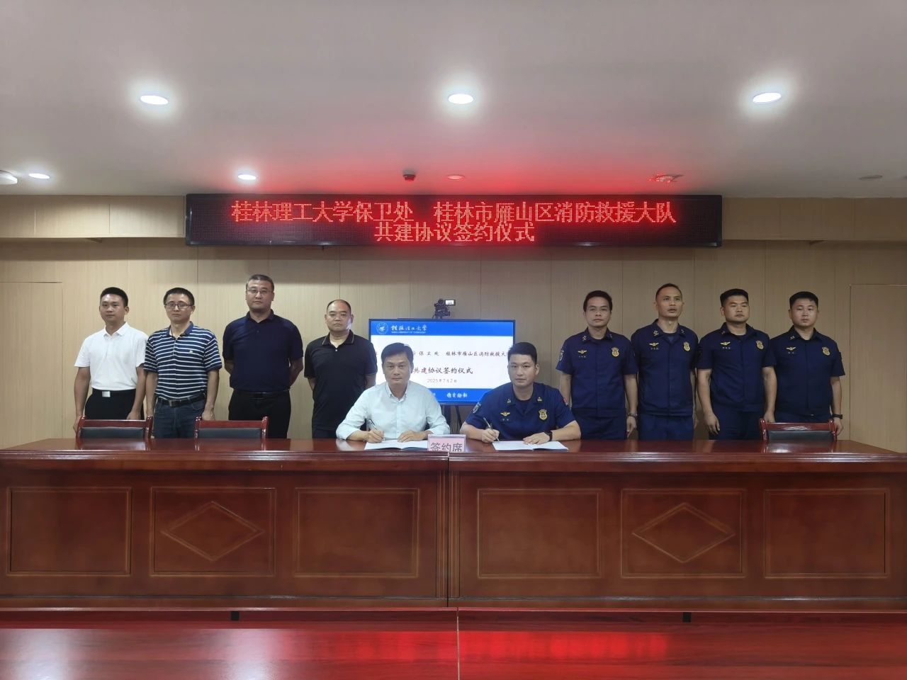 7月2日下午,学校保卫处与桂林市雁山区消防救援大队在雁山大队会议室举行共建协议签约仪式。学校党委武装部、党委保卫工作部、保卫处部(处)长张瑞一行5人参加。雁山区消防救援大队大队长徐勇、政治教导员李毕源热情接待了张瑞一行。