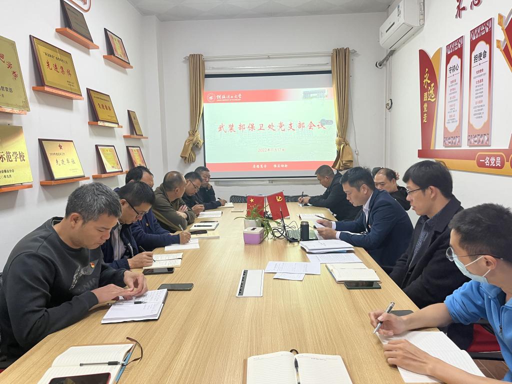 11月17日上午,武装部保卫处党支部在屏风校区保卫处备勤室召开全体党员会议,深入学习贯彻党的二十大精神。会议由武装部保卫处党支部书记张瑞主持,全体党员参加会议。