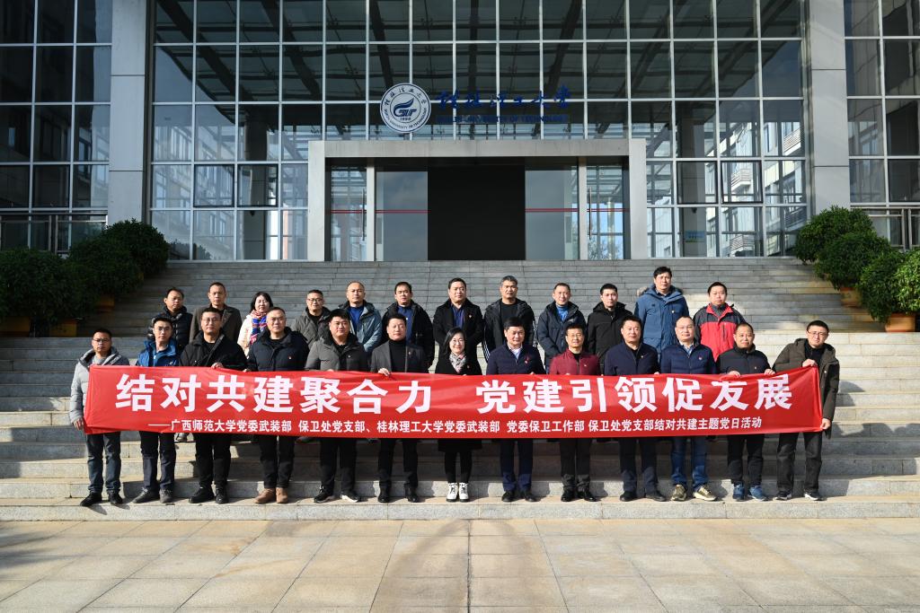 为进一步提升党建工作质量,实现党组织优势互补,以互建促自建,努力构建“资源共享、优势互补、互相促进、共同提高”的党建工作格局,12月21日上午,学校党委武装部保卫处党支部与广西师范大学党委武装部保卫处党支部在雁山校区开展结对共建主题党日活动。学校党委常委、党委统战部部长、机关党委书记邱杰出席会议,会议由学校党委武装部保卫处党支部书记主持,两校武装部保卫处党支部全体党员参加。